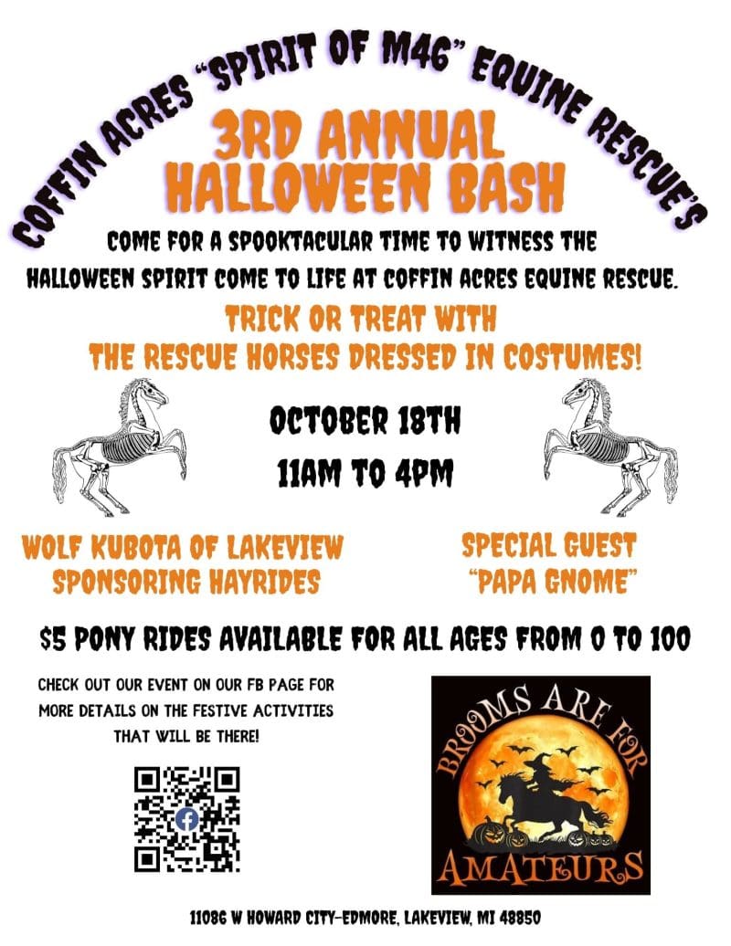 Family fun for all! Come celebrate Halloween with Coffin Acres "Spirit of M46 " Equine Rescue Visit the horses in their costumes with their buckets of candy for you again this year! Much more happening than what's listed on the flyer. We will update as things get put in order. A special thank you to Wolf Kubota Lakeview for sponsoring hayrides again this year! Also, Papa Gnome as a Special visitor.