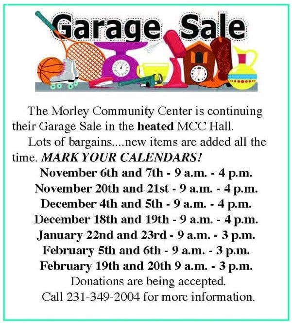 The Morley Community Center is continuing their Garage Sale in the heated MCC Hall.